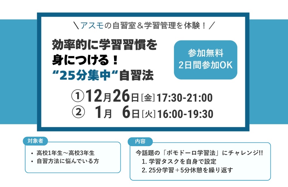 アスモの自習室&学習管理を体験!効率的に学習習慣を身につける!“25分集中”自習法(高校1年生~3年生対象)