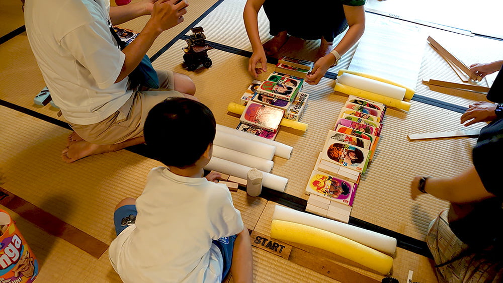 そしていよいよレース開始!各々のチームが考案したコースを3分以内に構築し、完成後マシンを走らせてタイムを競います。漫画を積んで坂を作り、距離と時間を稼ぐアイデアを複数のチームがトライしましたが、選んだ漫画が厚すぎたり傾斜をつけすぎるとマシンが詰まることが多く、同じアイデアでもパーツ選びやその場での判断力が問われる高度なレース展開となりました。攻めすぎるとゴールができなくて記録が残らないので、このあたりのバランス調整もレースの面白さですね。