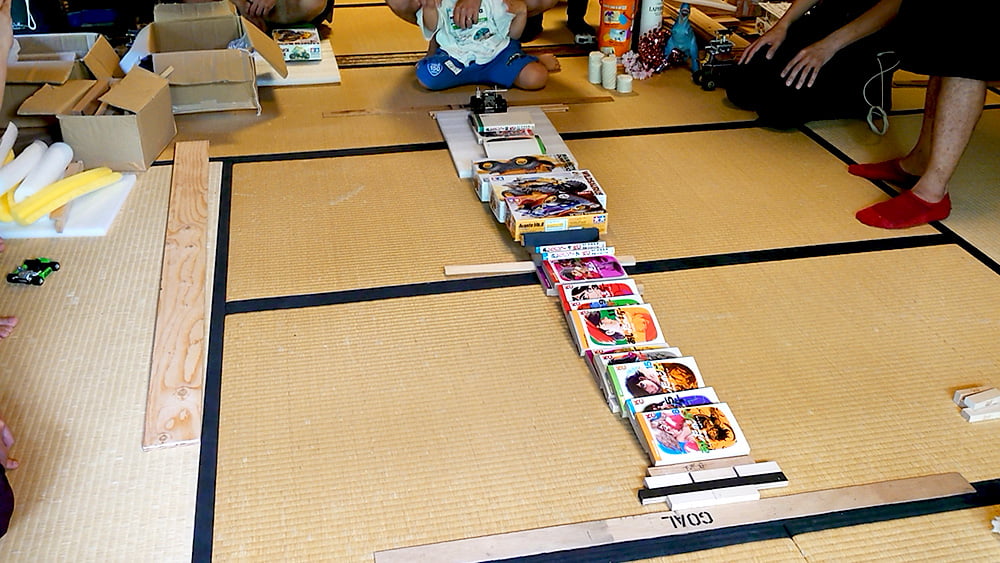 通常はマシンの『遅』さを競うレースですが、今回は今までと少し趣向を変えたルールで開催。マシン自体を『遅』くするのではなく、コースに工夫を施して速いマシンをどれだけ時間をかけてゴールさせられるかを競う大会なんだそうです。会場には板材や発泡スチロール、分厚い漫画などが用意され参加者はこれらのパーツを組み合わせて、『遅』いコースを作っていきます。ちなみにどれだけ遅くてもOKですが、進まないのは失格となるそうです。