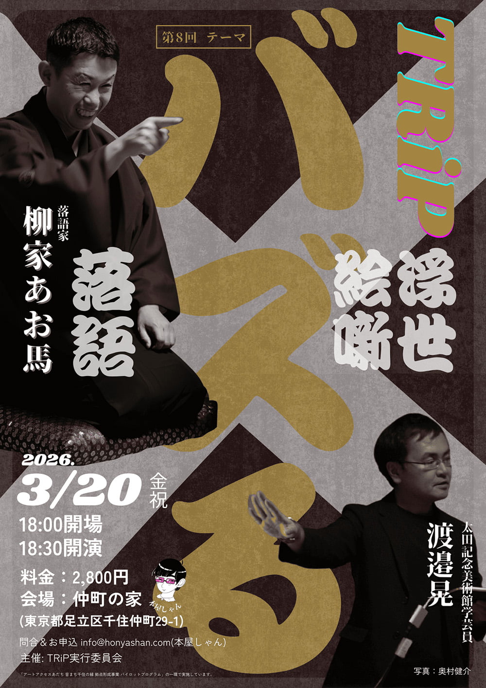 「TRiP」は、柳家あお馬、渡邉晃、本屋しゃんの3人が作る「落語と浮世絵が出会う落語会」です。